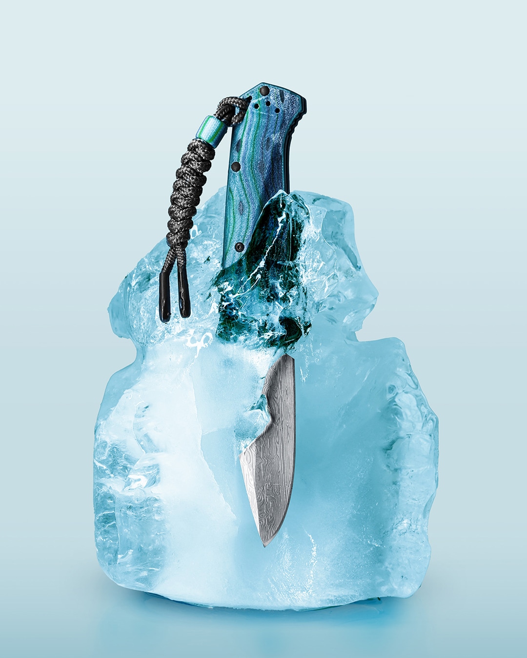 本モデルは、ブレードに鏡面仕上げを施したDamasteelを使用。 HRC58-60を誇る硬度のダマスチールブレードは、見た目の迫力と卓越した切断性能を両立しています。