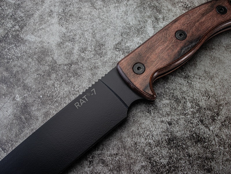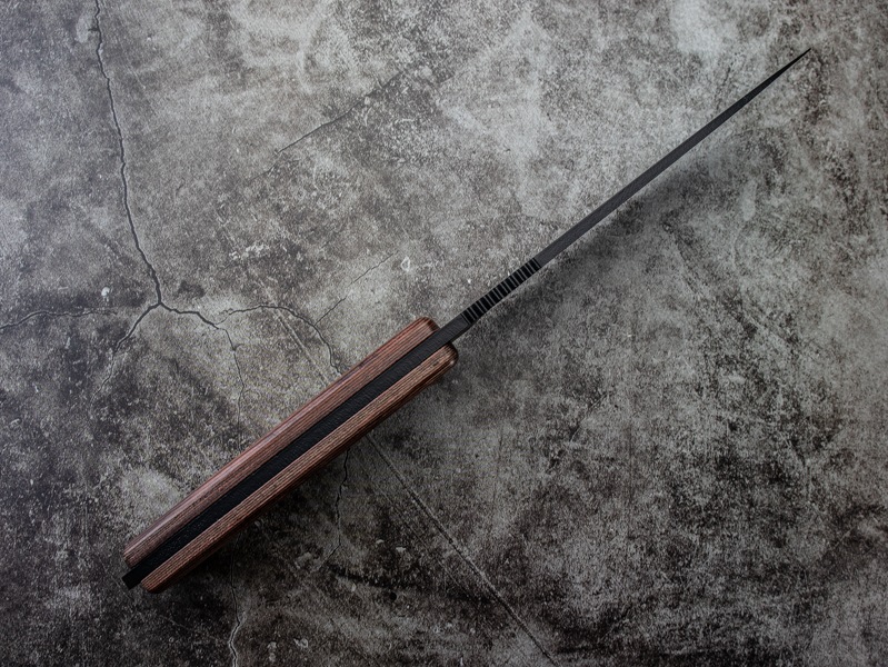 ブラック仕上げのカーボンスチールブレードと、積層ウッドハンドルを組み合わせた堅牢で実用的な仕様。