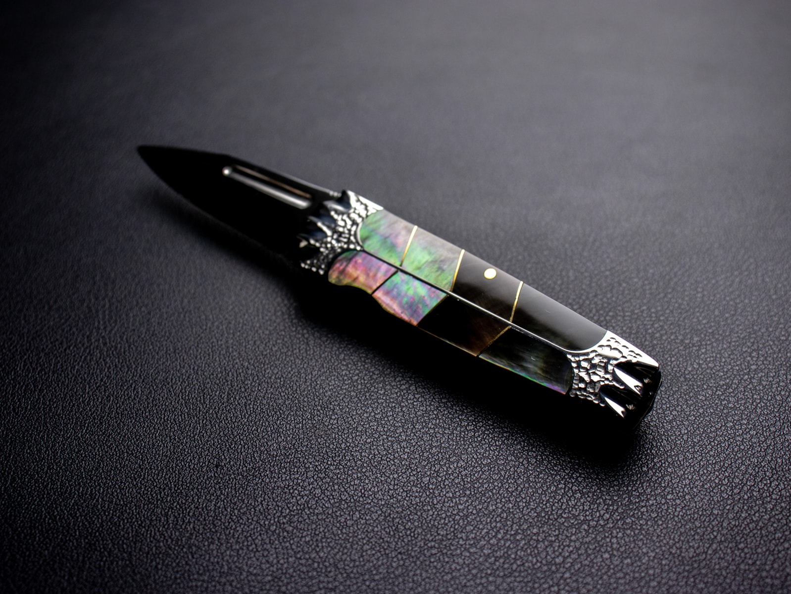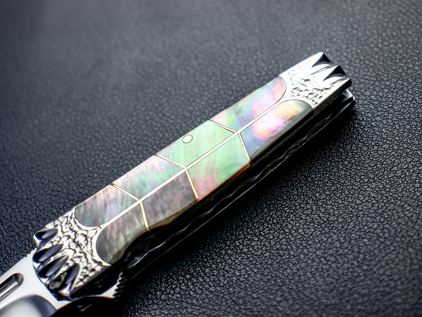 The handle features black mother-of-pearl inlays with clean detailing,