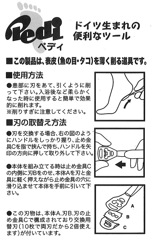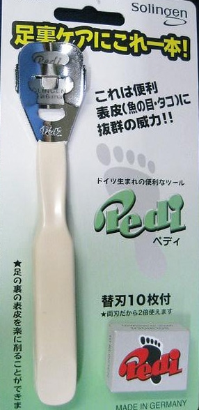 - これは便利! この製品は、表皮(魚の目・タコ)を薄く削る道具です。 患部に刃をあて、引くように削ってください。入浴後など柔らかくなった時に使用すると簡単で効果的に削れます。 ※削りすぎにご注意してください。