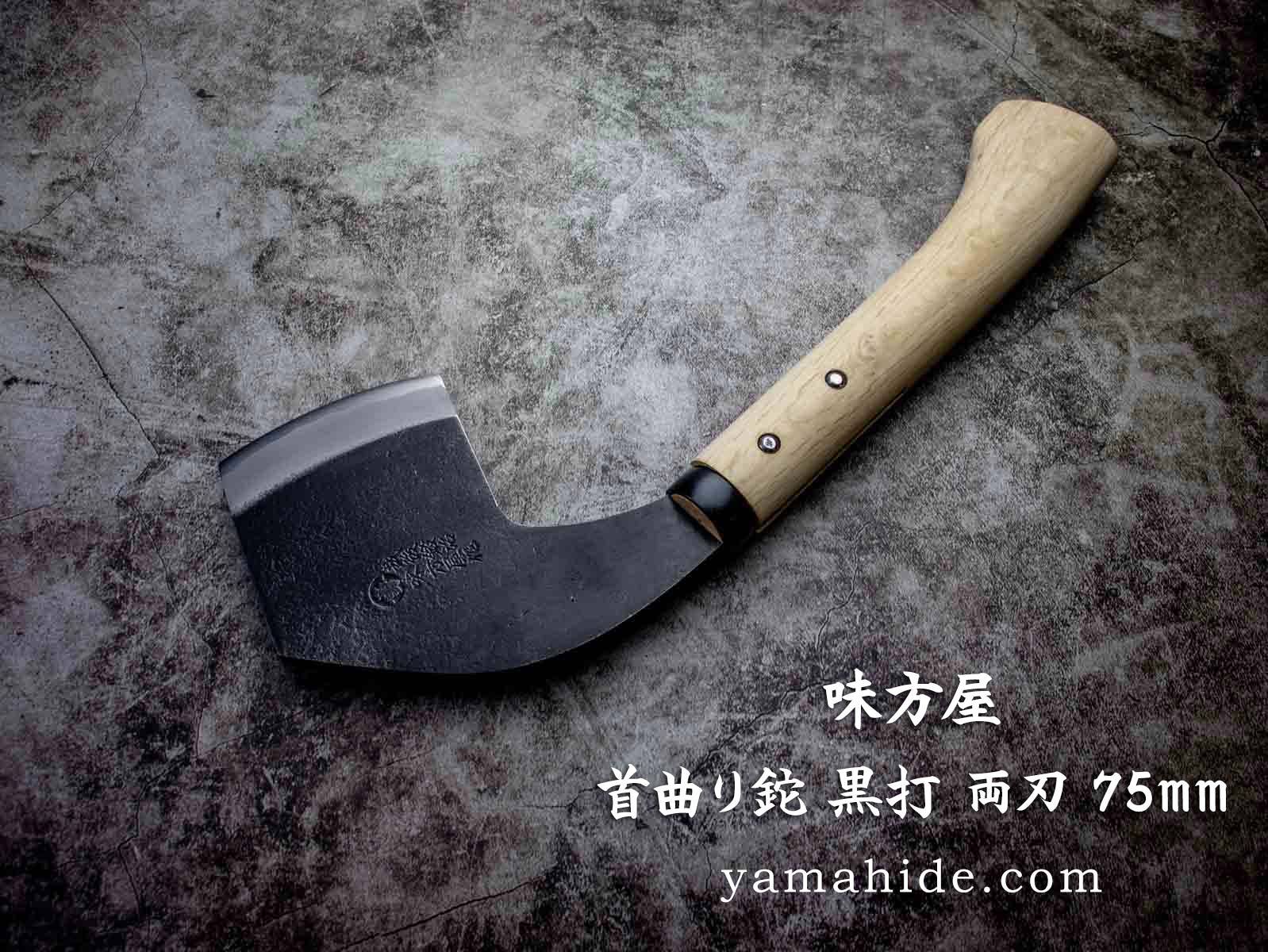 味方屋 首曲り鉈 黒打 両刃 75mm 刃当てカバー付き 安来鋼+極軟鉄 / 樫
