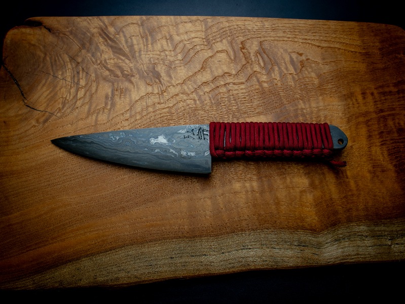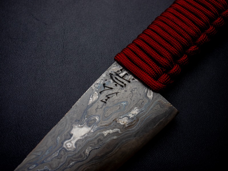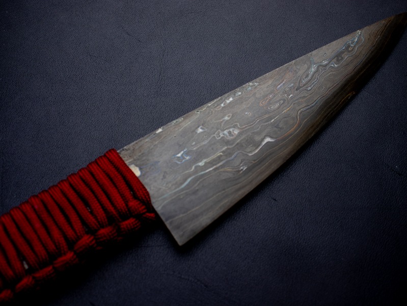 The bold damascus pattern flows dynamically across the blade, highlighting the depth and character unique to forged steel.